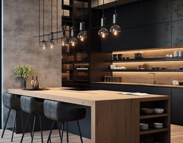 Dapur: Kabinet dapur berwarna putih dapat dipadukan dengan meja makan kayu dan kursi logam bergaya industrial. Tambahkan lampu gantung bergaya pabrik dan beberapa tanaman hijau untuk menyegarkan ruangan.
